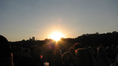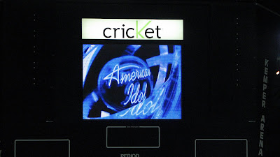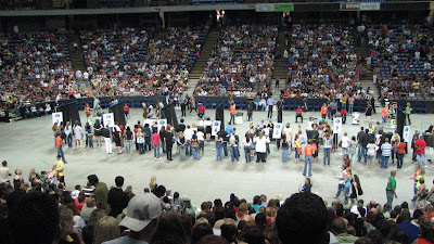 After all of that tv bull crap they started to let us in the building. I think I walked in the door around 9:30. By the time I was in my seat, they had already started singing the "group songs." This was actually REALLY REALLY cool. 10,000 voices singing in harmony- It was AMAZING. It did get old the 15th time we sang it, but thats tv.
